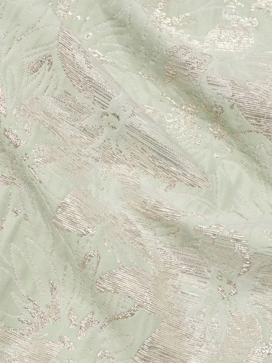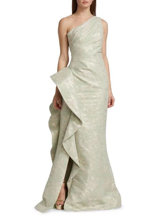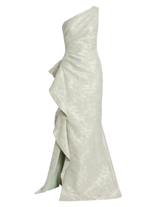 Cut in a one-shoulder silhouette, Teri Jon by Rickie Freeman’s sleevelesss gown is defined by lustrous floral-jacquard patterning and a three-dimensional ruffled detail at the side.
