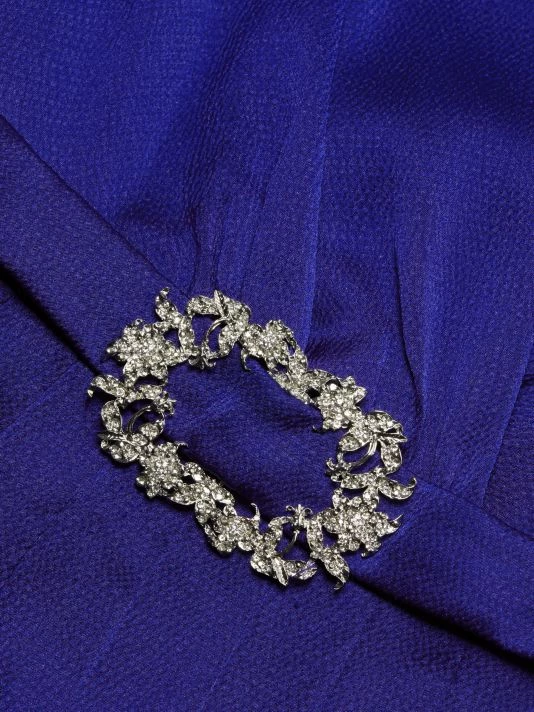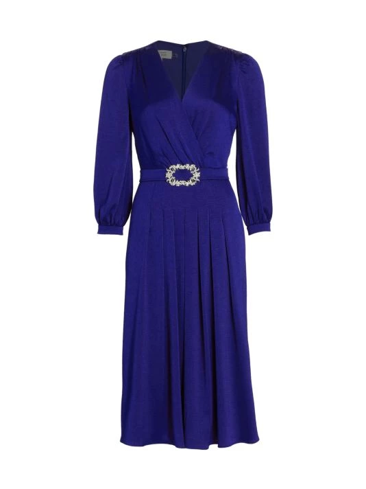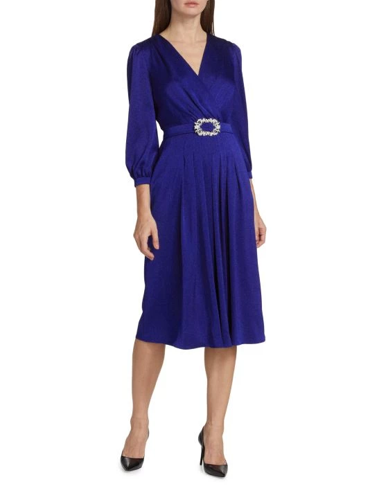 Teri Jon by Rickie Freeman’s satin knee-length cocktail dress features a belted waist with an embellished buckle for additional shine.