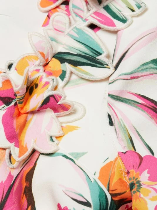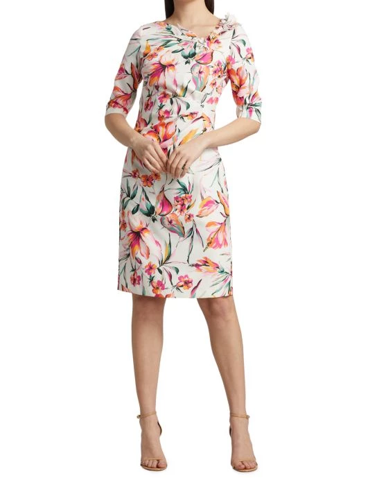 Decorated in a vibrant floral print, Teri Jon by Rickie Freeman’s cocktail dress flaunts a round neck adorned with three-dimensional appliqués. This knee-length piece is finished with a back vent.