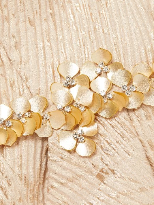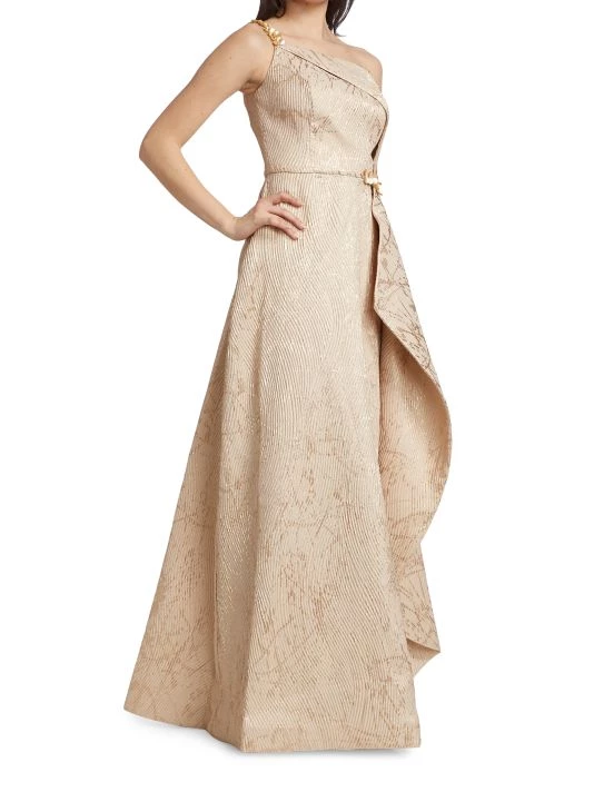 Pleated metallic jacquard gown in a one-shoulder silhouette with contrast sequin embellishments and a draped three-dimensional skirt.