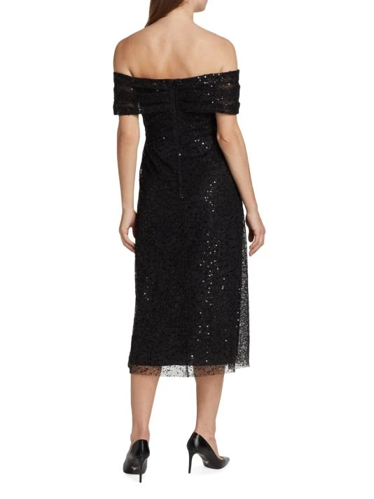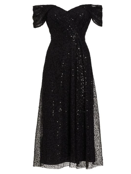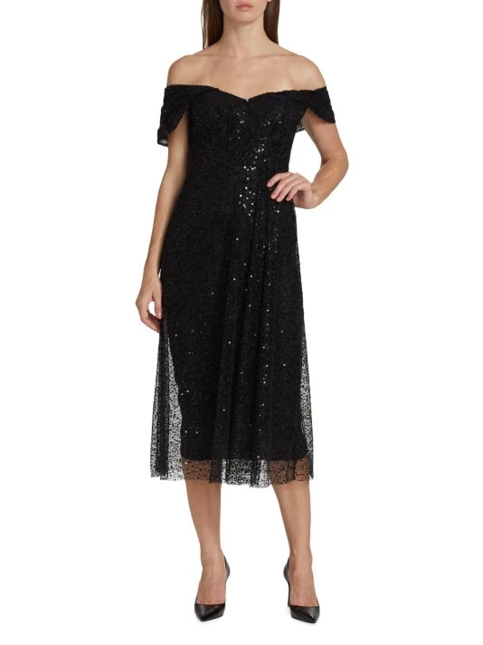 Teri Jon by Rickie Freeman’s mesh midi-dress is decorated with sparkling sequin embellishments. Showcasing an elegant off-the-shoulder neckline, this glamorous style is detailed with short sleeves and an A-line skirt with a pencil underlay.