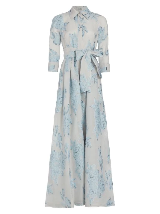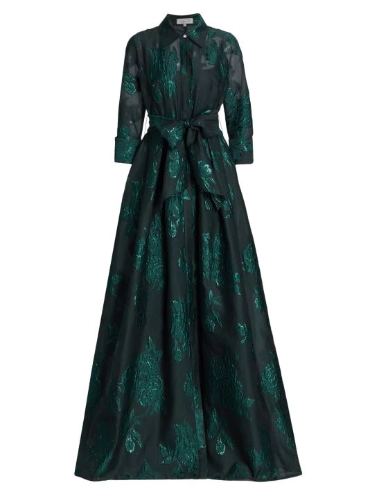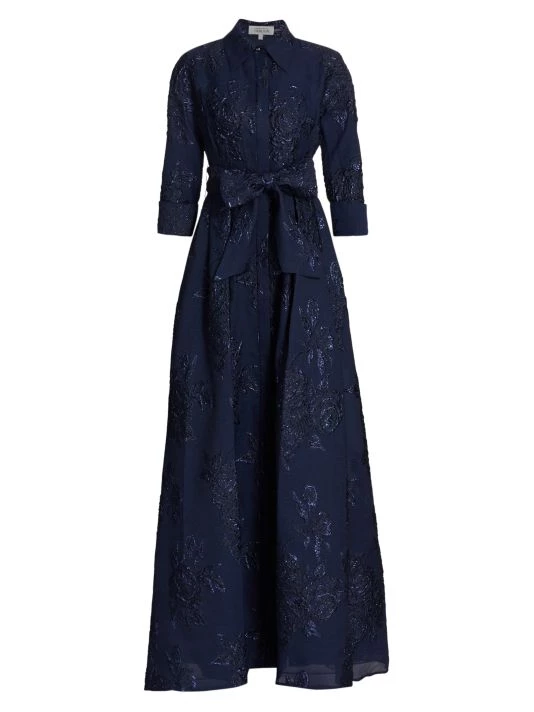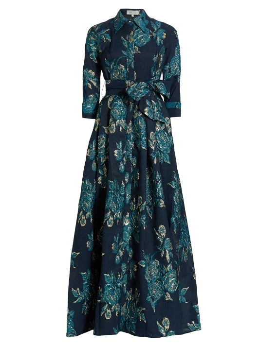 A dramatic shirtdress boasting statement waist bow in a stunning metallic jacquard finish.