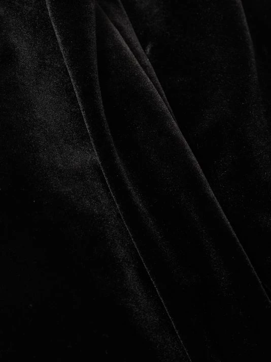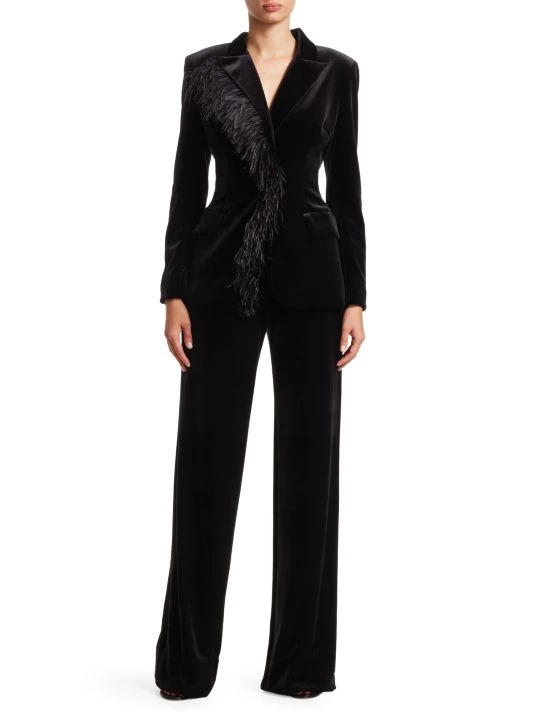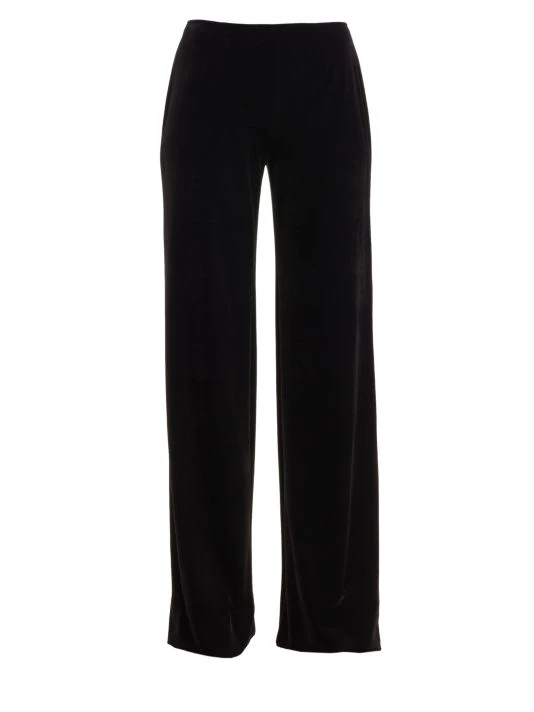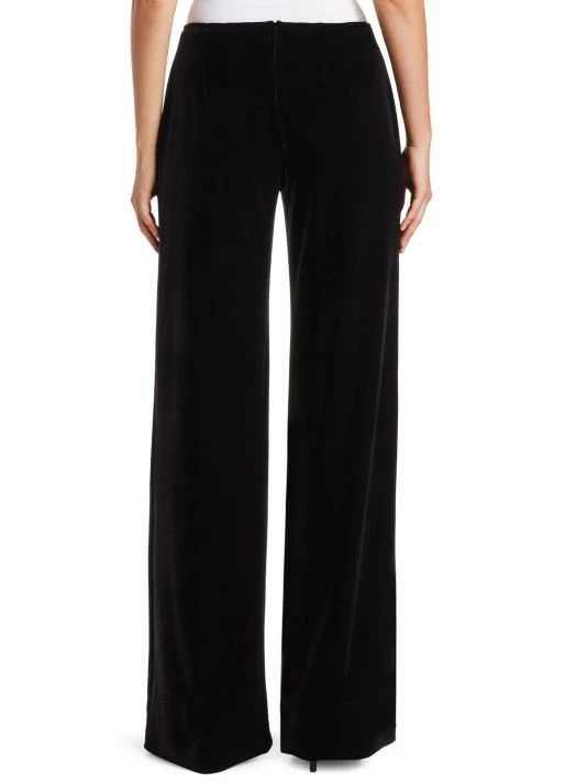 Velvet adds a luxurious touch to back zip pants that boat a clean front and wide sweeping legs.